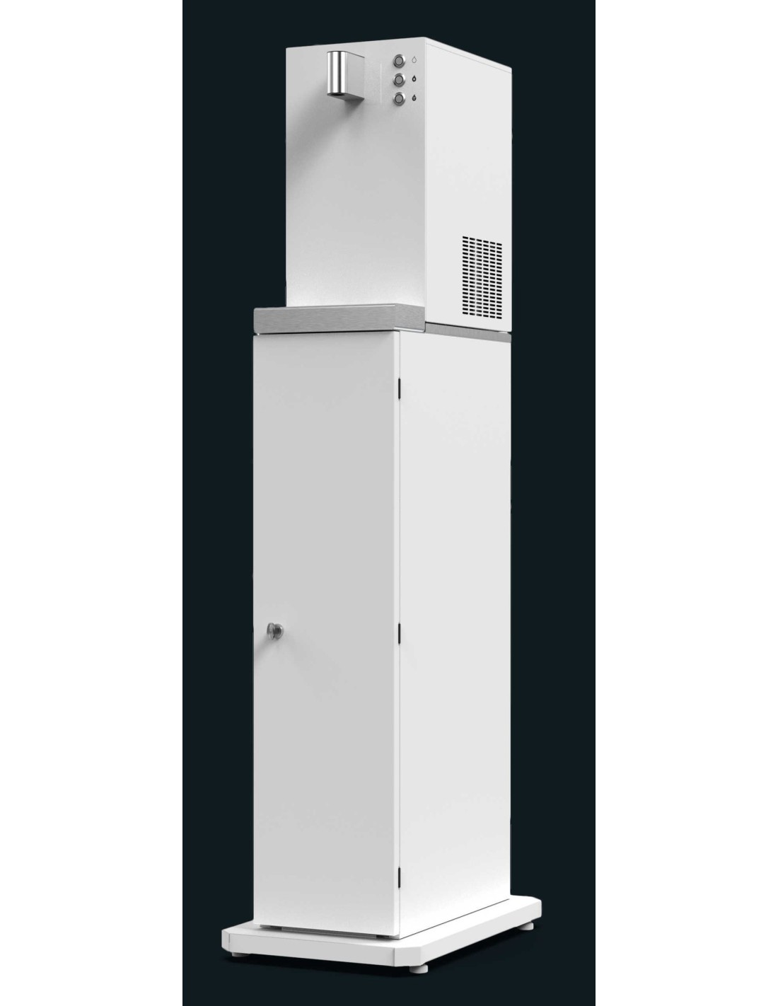 Säulenanlage, Kühlleistung 40 Liter/Stunde, Wasser-Ultrafiltrationssystem zur Entfernung von ungelösten Partikeln, Zysten, chemischen Verunreinigungen, Chlor, Viren und Bakterien. Das produzierte Wasser ist rein, geruchlos, geschmacksneutral, ohne Veränderungen des Mineralgehalts, frei von Mikroplastik und PFAS.