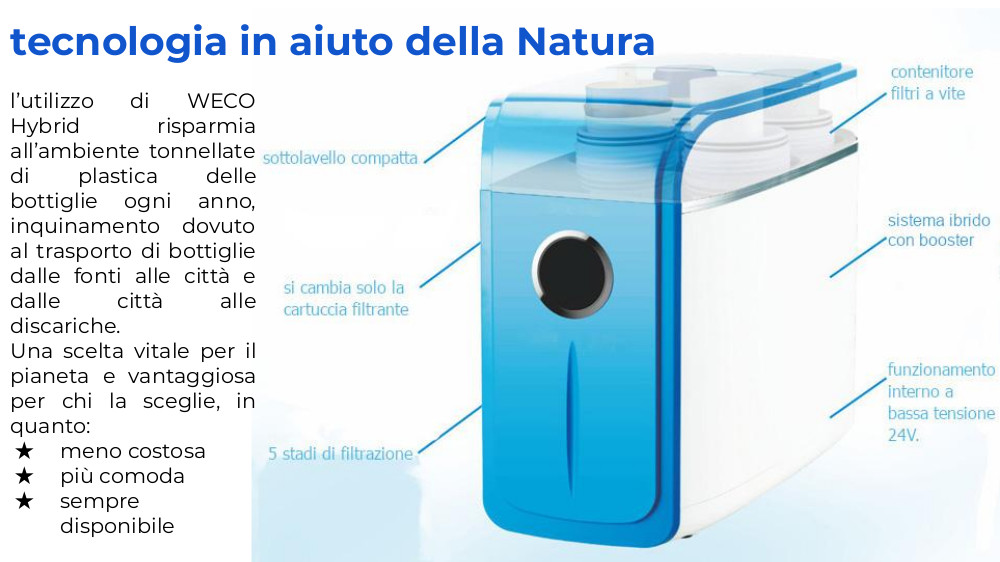 l’utilizzo di WECO Hybrid E risparmia all’ambiente tonnellate di plastica delle bottiglie da smaltire, oltre a l'inquinamento prodotto dai trasporti delle bottiglie: dalle fonti alle città e dalle città alle discariche.